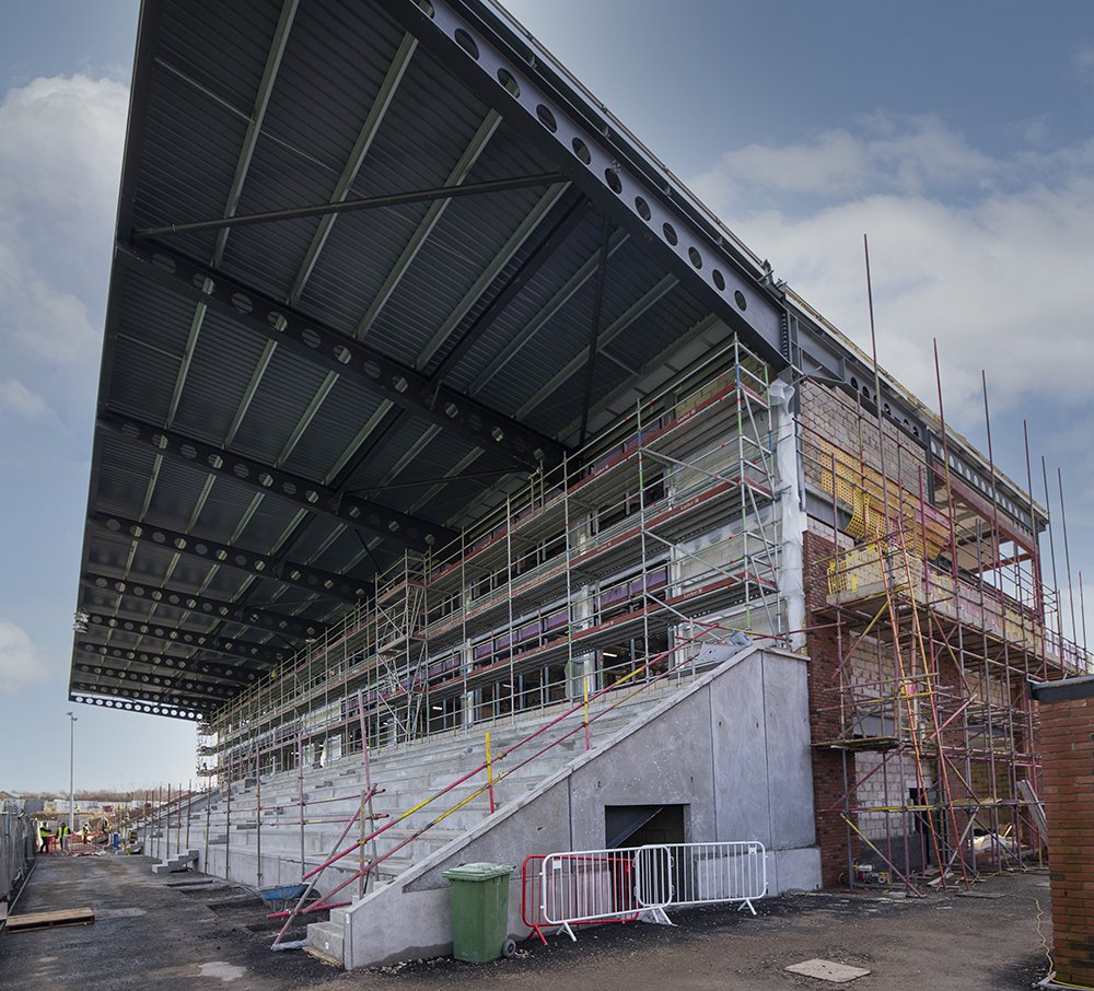 In addition to the three-storey, covered grandstand and ancillary facilities, the stadium also features 23,000 sq ft of commercial space, including four ground-floor retail units and two upper floors of flexible workspace and hospitality space.